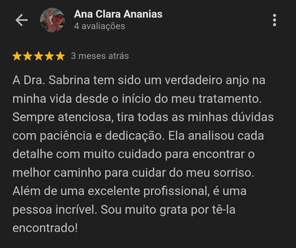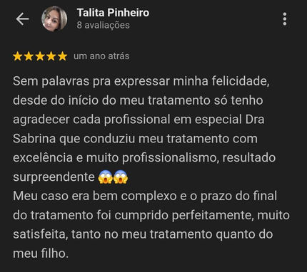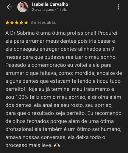 Realizei meu tratamento com a Dra Sabrina, foi experiência incrível, confiei no trabalho e entregou um excelente resultado!! Amando meu sorriso novo